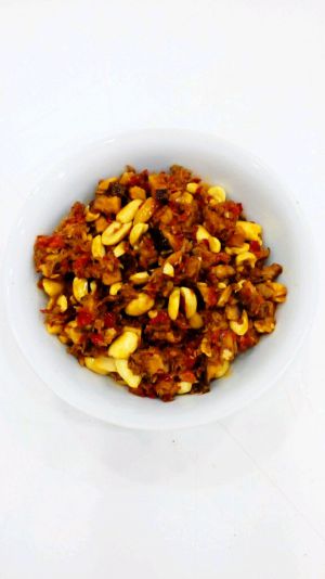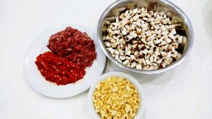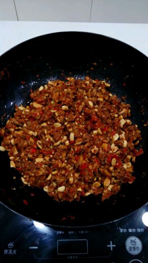 香菇、牛肉洗净切小块儿,花生米烤熟去皮,辣椒洗净用料理机打碎。