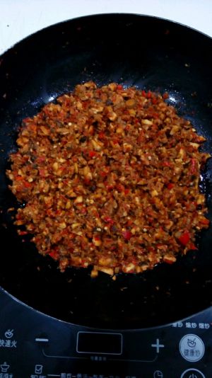 辣椒、香菇块儿、老抽同时倒入锅中,小火加热、不停搅拌。
