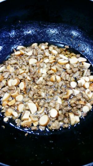 牛肉炒干水份(油尽量多一些),放香菇根儿炒一会儿(香菇的根部更有嚼头哦)