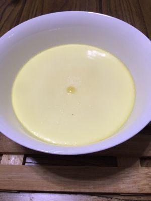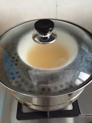 倒入一点温开水,加盐搅匀,颜色稍微变化一点就好,不要太烫的水就成了蛋花汤了,盖上保鲜膜,防止水滴落入,没有可不用,我是凉水入锅时间会长一点,15分钟到20分钟