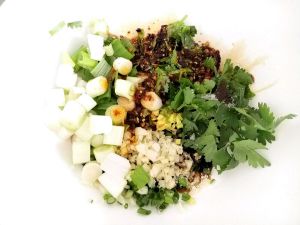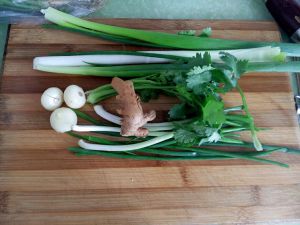 姜蒜小葱切末,大葱香菜切段,加入适量生抽,白糖,辣椒油,搅拌均匀,备用。