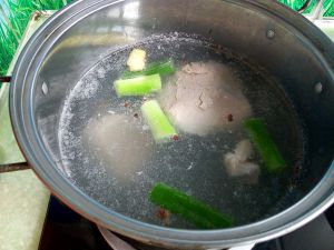 猪肉洗净,放入锅里,加水没过肉,加入大葱段,花椒,两片姜,适量料酒,烧开煮30分钟