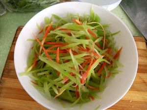 莴笋、胡萝卜切丝,撒点盐,去掉蔬菜多余的水分,腌五分钟后,再次洗净挤干水分,备用。