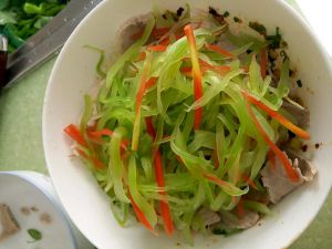 放入切好哦肉片,蔬菜,充分搅拌均匀,放置十分钟入味,即可装盘食用。