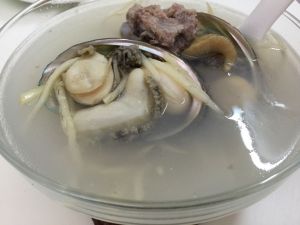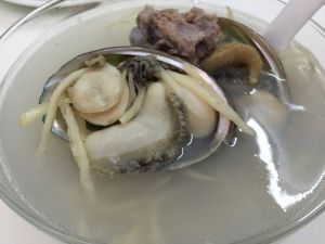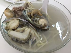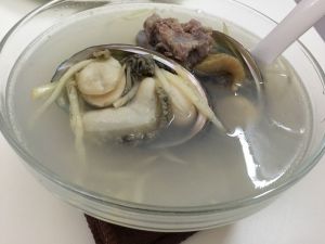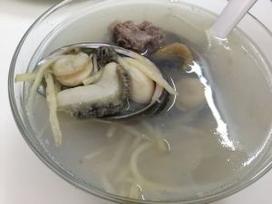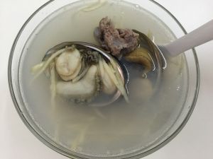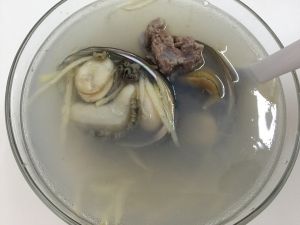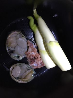 鲍鱼清洗干净切片、骨头冲洗掉血水、笋刨丝