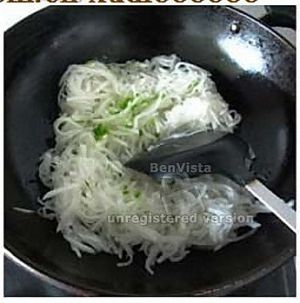 将萝卜丝下葱油中拌匀,加入少许白糖、鸡精调味即可。