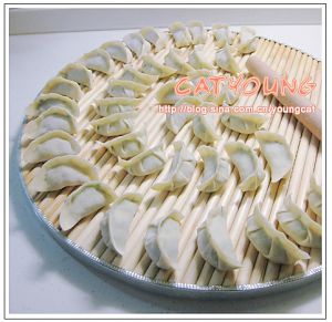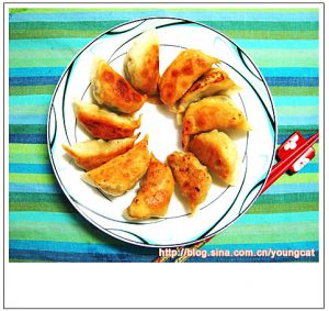 稍煎一下后,往锅内喷入适量的水,盖上锅盖,让水气将锅贴蒸熟