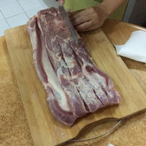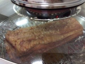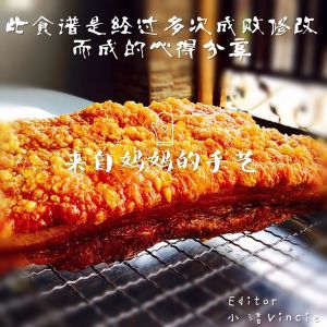 把猪肉吊起,并在猪皮刷上一层醋,待风干后再刷上一层醋,一共要刷上三次醋