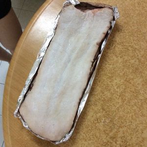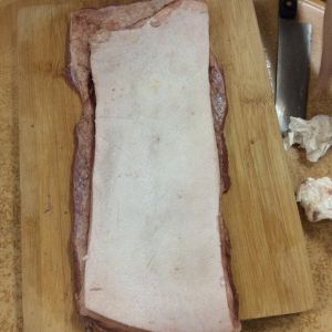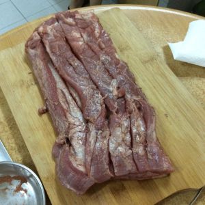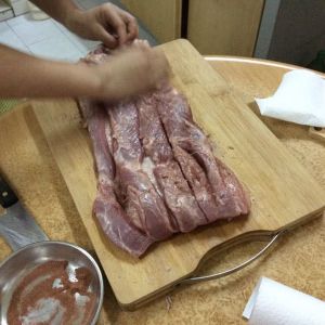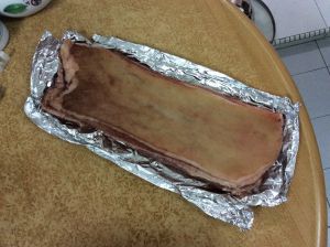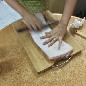 用刀锋大略刺猪皮,然后在猪皮上涂层盐(薄薄一层就好)