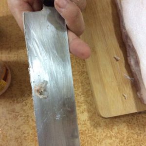 这是刮猪皮后粘在刀上的,得用吸油纸擦掉