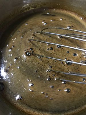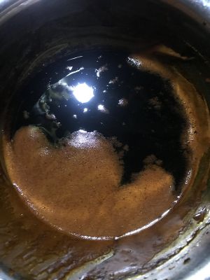 倒入柠檬汁后,再度中火煮开以后,转小火,慢慢熬煮,锅边沸腾的地方如果出现糖的结晶,可以拿一个毛刷沾水,在锅壁上刷一圈。水沿着锅壁流下去的时候可以将锅壁上的糖洗刷到锅里去。我是用电磁炉转120熬煮了40分钟,糖浆的颜色越深。最后熬到差不多琥珀色,就要关火了。