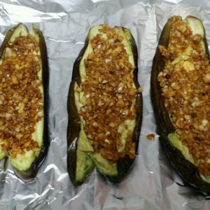 将炒好的蒜末均匀的铺在准备好的茄子上,依个人口味洒上胡椒粉、孜然粉、辣椒粉,烤箱210度烤15分钟左右,没有烤箱可以用微波炉烤8分钟左右出炉