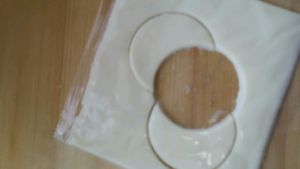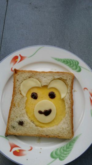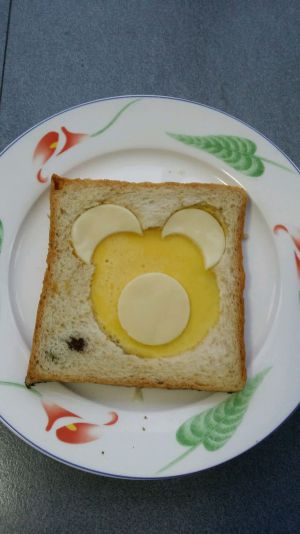 奶酪片用小瓶盖抠出一个整圆,两个半圆。做小熊的耳朵和嘴巴。