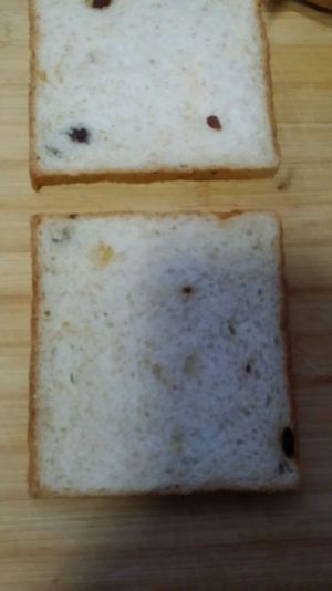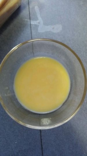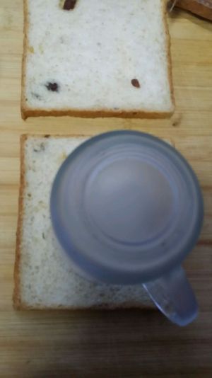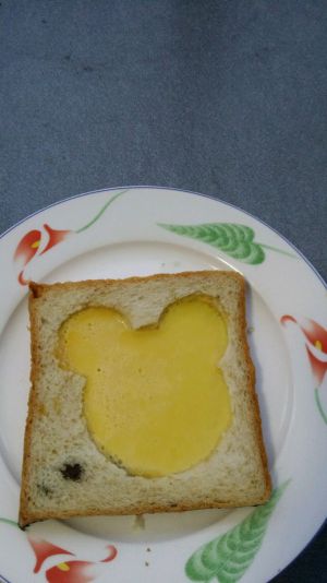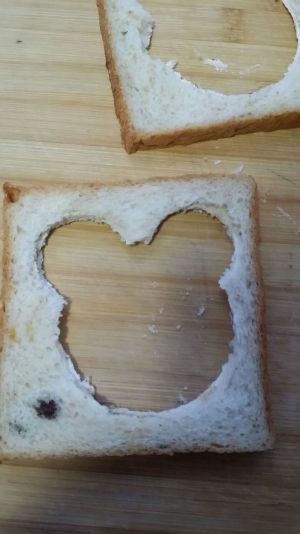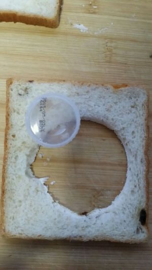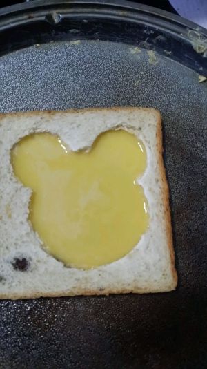 把吐司片放进预热好的电饼铛。也可以用平底不粘锅,不需放油。把蛋液倒入吐司空当处,小火,使蛋液凝固。