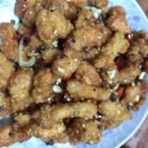 倒入葱姜蒜爆香后倒入炸好的鸡米花