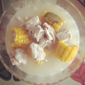 three^_^ 先将玉米放入锅中,在放入排骨,接着放入配料,大火煮开。换小火慢炖。出锅前撒上盐调味即可。