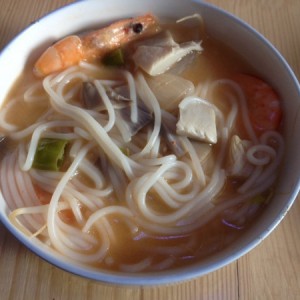 加水,放入柠檬,虾,椰汁,泡好的粉或河粉,煮沸。