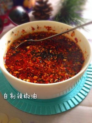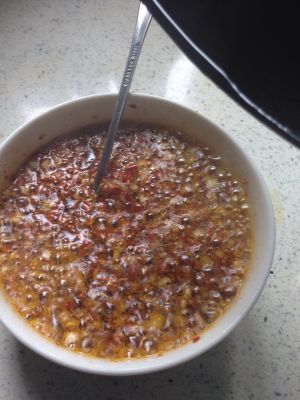 油烧热,均匀的泼在辣椒碎上面!搅拌均匀!