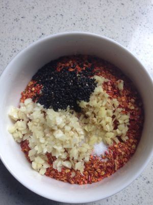 干辣椒切碎,放入姜末、蒜末、一小勺盐!放入适量熟芝麻!