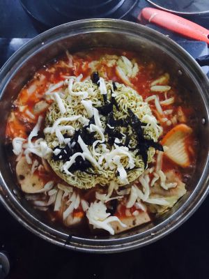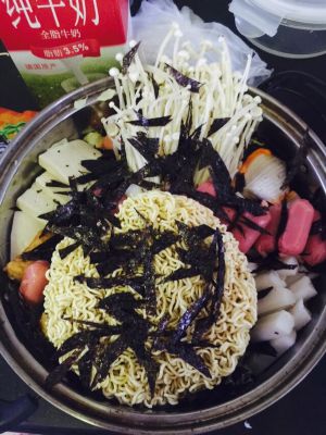 煮熟之后放入辛拉面、紫菜碎片及碎末芝士!芝士融化后撒点辣椒粉就可以食用咯!味道不差于韩国火锅店哟!