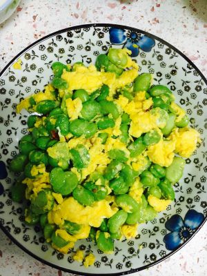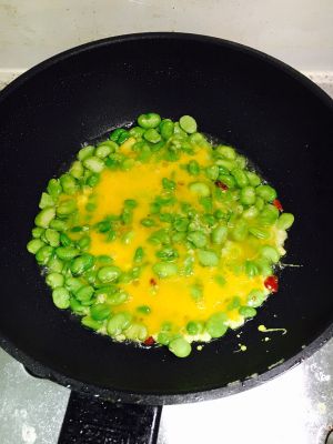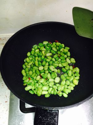 放入洗净的蚕豆米和干辣椒段,快速翻炒,此时放入的盐。