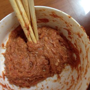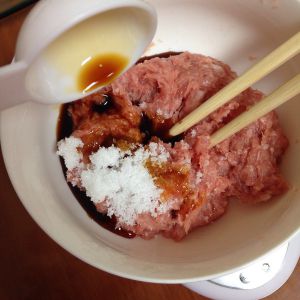 继续一个方向搅拌,使蛋液和肉混合均匀。得到胡椒味的肉糜