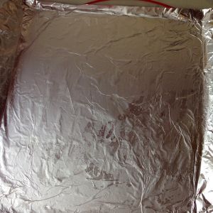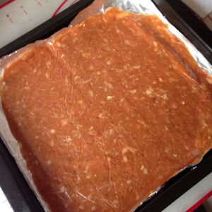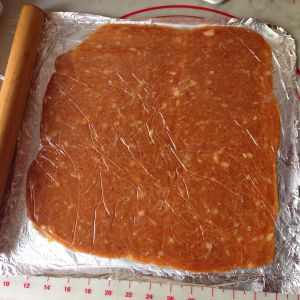 取1/2五香味的肉糜放在锡纸上,盖上保鲜膜,稍整形成方形