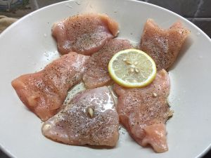 鸡胸用刀背轻拍一下,这样有利于进味儿,然后将黑胡椒粉和少量的盐正反均匀的撒在鸡胸上,柠檬可以切成片然后挤出汁撒在鸡胸上。腌制15分钟左右。