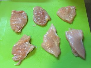 将买来的鸡胸切块,去掉鸡胸上面那层白色的油。如果特别厚,可以横着切一刀。不过不要太薄,吃起来没有嚼劲儿