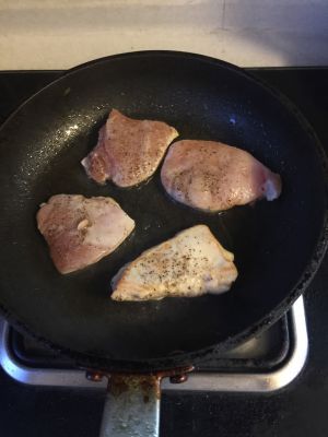 热锅,我用的橄榄油,等油热以后放入鸡胸,注意转为小火煎制。看情况翻面。由于之前用刀背拍松了,所以比较容易熟,可以用筷子扎一下试试。