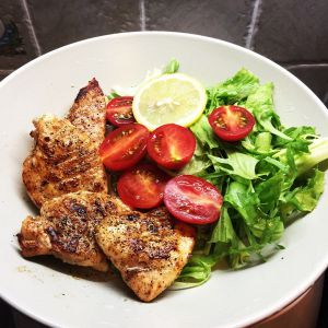 搭配上你喜欢的蔬菜,我搭配的苦菊,生菜,小番茄,把鸡胸乘出。根据口味,可以再加一些黑胡椒。完成。健康又美味~适合减肥的你
