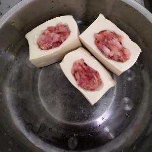 豆腐中间用汤匙,挖一小洞,把肉放入进去,