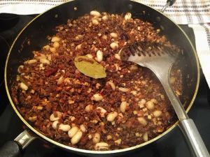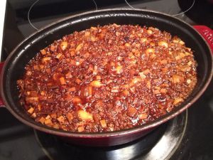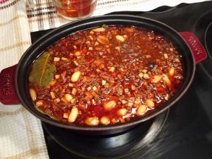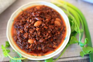将炒好的料倒入铸铁锅中,倒入齐高的高汤或者开水,小火炖,8个小时,期间要查看水量,不要让水烧干,不然会糊锅底,如果放了八角桂叶干辣椒什么的,可以1个多小时后就取出来,不要让他们碎在酱里。