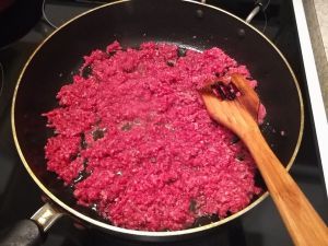 锅中放入多一点油,将牛肉放入冷锅冷油中开炉火,边捣开边翻炒,让锅里的水分全部蒸发掉,炒到牛肉碎全熟变色,成出来。