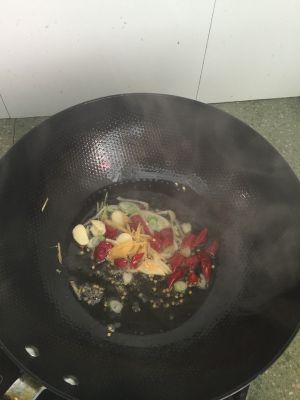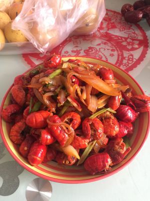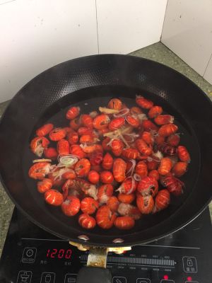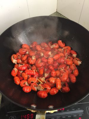加入龙虾尾,豆瓣酱,老干妈,盐,一起翻炒。