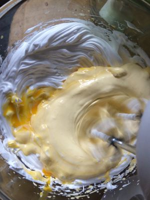 把蛋黄加入打发的蛋白霜里继续搅打均匀。
