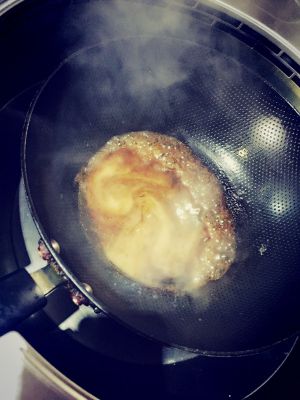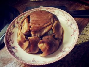 晕,肉出锅了,我忘拍照了,蒸肉的取出方式:首先是蒸碗端出,用筷子检出八角大料葱姜,然后拿一个大盘子扣在蒸碗上面,两只手要捏紧盘子和碗边,不要让它有缝隙,最后快速翻转,碗倒扣过来,要直立拿起,不要影响塑形后的扣肉和猴头菇。
