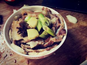 五花肉喂料和正常的扣肉一样煮好备用,煮肉的汤记得留一碗备用。