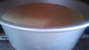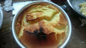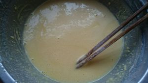 将三分之一蛋白到入蛋黄液中上下翻搅,搅匀后倒入剩余蛋白搅匀,倒入8寸模具中,轻震两下,震出气泡