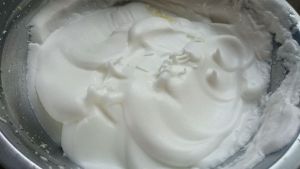 打发蛋白的过程,分三次加完剩余的糖,用打蛋器打发蛋白,如图形状即可