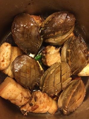 再铺上五花肉块, 鲍鱼,注入海鲜生抽, 老抽, 料酒, 俩碗鸡汤或开水, 基本上是液体刚刚淹没固体。 盖上高压锅盖子, 大火, 上气后, 减到最小火, 一直炖了俩钟头。
