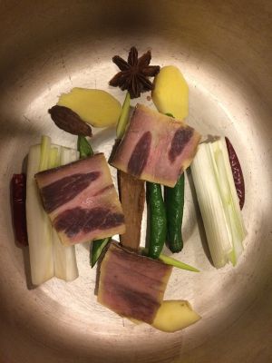 带骨五花肉切大块, 也过油划一下。