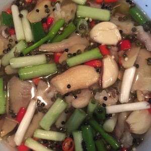 把各种调料处理好,指天椒、葱切段,姜切片,蒜拍一下,同麻椒一起放入大碗内。