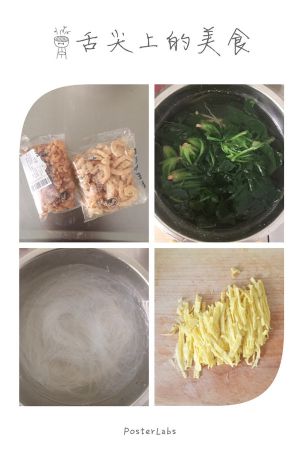 准备好上述材料,菠菜洗净,过水抄一下放入凉水盆中,粉丝用温水净泡到稍微有些软就好了。鸡蛋打散,放入锅中摊成小饼,摊熟后用刀切碎即可,也可以在出锅前用筷子搅成细碎,颗粒不要太大。