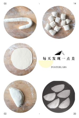 醒好的面团搓成长条,切成相对等的小段,擀成薄皮,在另一半放入馅料,对折捏合即可,我简单修饰了一下花边,亲们可不弄。用煎锅或饼秤都可以,记得翻面的时候,在盒子上面记得稍稍刷层油,提亮,外焦里嫩哟!