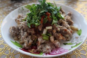 蒸30分钟即可,蒸20分钟就可以尝一尝,喜欢软的再蒸。 上面放辣椒面味精,香菜和葱。就可以吃啦。味道极棒。