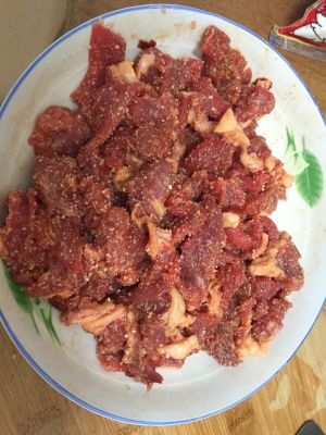 1 肉切条or块,放适量蒸肉粉,我不是那么喜欢吃太多粉,就放的少。2 放一勺豆瓣酱,放一勺油,放适量盐。3 盐不要多放,蒸肉粉里面有盐。