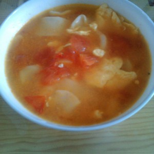 锅里放油,鸡蛋打散倒入,翻炒,然后用铲子捻成小块,盛到碗里,锅里再放少许油,放入西红柿翻炒,炒出汁水后倒入炒好的鸡蛋,搁适量盐,翻炒一会加水——这一步没照相,跟西红柿炒鸡蛋一个步骤,只是最后加入水用来煮面