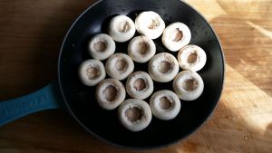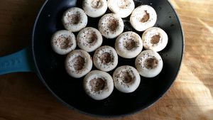 选择大小均匀的口蘑、将蘑菇清洗干净后去掉蘑菇蒂,将蘑菇盅朝上摆放在平底锅里。(如果不计较热量的话可以使用一小块黄油,如果想要热量更低,建议使用橄榄油)