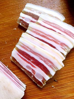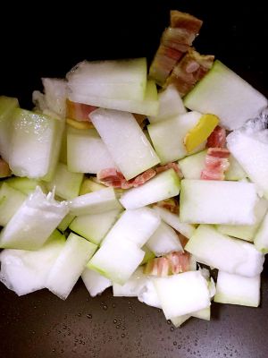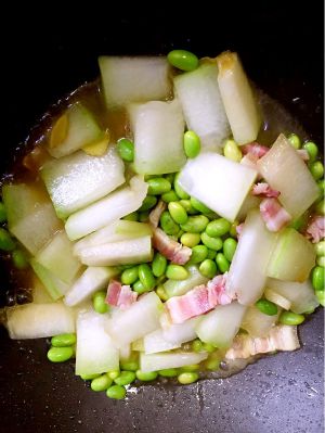 咸肉切片、冬瓜切厚片、毛豆开水焯一下。